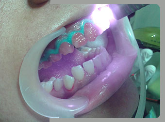 HOME BLEACHING: It involves use of bleaching agent of varying percentages like 10%, 15%, 20 % in specially fabricated trays (Gum Shields) that are to be worn over the teeth for 3-7 days. It is advisable that you visit your dentist after 2-3 days so that progress of teeth whitening can be evaluated and appropriate recommendations on further use can be given. It gives 2-3 shades whiter in 3-5days.