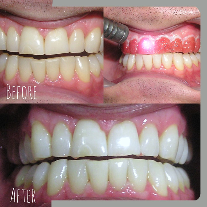 SOFT TISSUE LASER. It gives almost 6-8 shades whiter teeth in less than an hour.