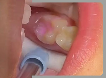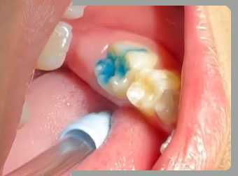 The teeth to be sealed are thoroughly cleaned and then surrounded with cotton to keep the area dry. A special solution is applied to the enamel surface to help the sealant bond to the teeth. The teeth are then rinsed and dried. Sealant material is carefully painted onto the enamel surface to cover the deep grooves or depressions. Depending on the type of sealant used, the material will either harden automatically or with a special curing light